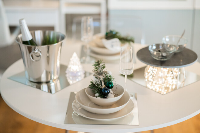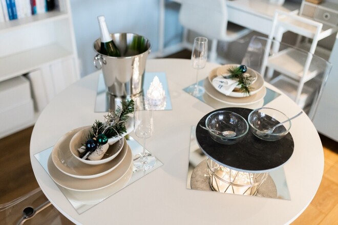 Kā izrotāt svētku galdu, pie kura sēdēs tikai divi cilvēki, kuri svētkus atzīmēs pilsētas dzīvoklī un kuri vēlas netradicionālu galda noformējumu? “Veidojot šādu galda klājumu, nav iespējams nošaut greizi, tikai jāatceras galdā likt saskaņotus, vienādus priekšmetus. Tā kā maltīti ieturēs tikai divi cilvēki, tad pusi galda var aizņemt arī neikdienišķi priekšmeti. Saskaņotam koptēlam svarīga ir vienota tematika, piemēram, Ziemassvētku eglīte, kāda konkrēta krāsa vai materiāls, piemēram, spogulis,” iedrošina interjera dizainers.