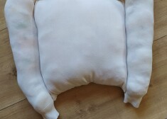 2. Auduma atgriezumus sajauc kopā ar sinteponu un vispirms pildi piedurknēs. Tad piedurkņu galus aizšuj ciet.