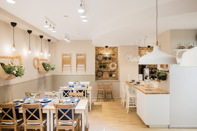 “Izmantojiet brīvās sienas – tās ir lieliski piemērotas dekorācijām. Pie tām novietojiet dažādus plauktus – tas radīs mājas sajūtu. Kafejnīcā saglabāju dažas detaļas no vecā interjera un kombinēju tās ar jaunām, izvietojot pie sienām – tas piešķir telpai autentisku izskatu un turpina stāstu par šīs vietas seno vēsturi. Vēl viena oriģināla ideja – koka krēsli tika izvietoti pie sienām un kļuva par aksesuāru, kas arī palīdz justies kā mājās,” stāsta Ribaka-Orlova.