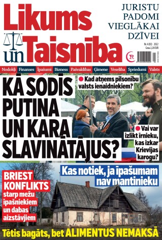 Vairāk lasiet jaunajā “Likumā un Taisnībā”. Lasiet arī, vai priekšnieks var atlaist ar īsziņu; vai var izlikt īrnieku, kurš slavina Krievijas agresiju; cik izmaksā mantojuma līgums; kam pievērst uzmanību, iegādājoties īpašumu; kā piedzīt uzturlīdzekļus.