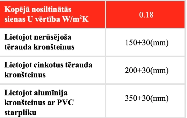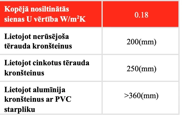 No uzrādītajām tabulām redzams, ka siltumizolācijas biezums palielinās gandrīz 2 reizes, ja sistēmas stiprināšanai izmanto alumīnija kronšteinus..