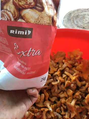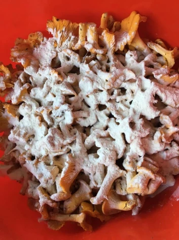 2. Pārkaisiet gailenes ar miltiem. Uz kilogramu sēņu vajadzēs aptuveni divas ar kaudzīti ēdamkarotes miltu.