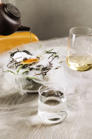 Kā tilts starp sauszemi un okeānu. Kā smalka, noslēpumaina saikne starp materiālo un garu pasauli – tāda bijusi jūraszāļu loma Ziemeļamerikas iezemiešu mitoloģijā. Tāpēc vakariņu stāsta pirmā nodaļa līdzinās rituālam, kurā ieved baltā dūmakā tīts dzēriens – sāļš kā jūras ūdens. Tā aromāts ievij atmiņās par siltām vasaras naktīm, atgādinot tik pazīstamo pirts zālīšu smaržu. Rituāla noskaņu rada salvijas ēteriskā eļļa un sausais ledus, bet dzērienu vizuāli ietērpj austeru čaulas, akmeņi un kaltētas jūraszāles, apsolot, ka stāsta turpinājums būs tikpat aizraujošs. Vien jāļaujas.