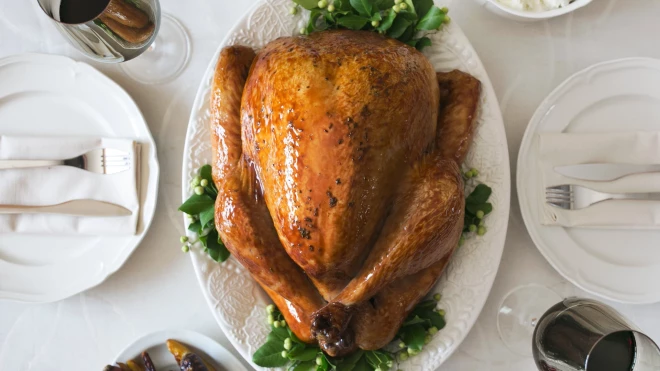 - Pārvieto tītaru uz iepriekš sasildīta šķīvja un noņem degunu, spārnus un stilbiņu galus: tos vari pataupīt gaļas mērcei. Atstāj tītaru uz vismaz 45 minūtēm atpūsties. Tikmēr vari pagatavot gaļas mērci. Pirms tītara griešanas neaizmirsti izņemt no spārniem paslēptās lauru lapas.
