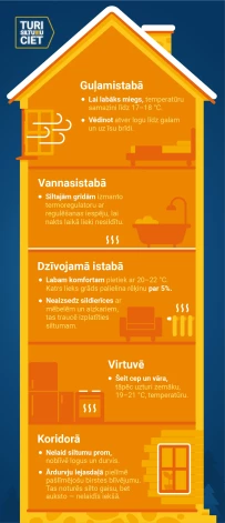 - Uzturi telpu temperatūru normas robežās. Optimālā telpu temperatūra rudens un ziemas sezonā, kad uzturies mājās, ir no 20 līdz 22 °C.