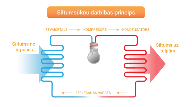 Siltumsūknis darbojas pēc līdzīga principa kā ledusskapis, taču pretējā virzienā. Siltums ledusskapī no iekšpusē esošajiem produktiem tiek novadīts uz āru – ledusskapja aizmugurē esošo siltuma atdeves elementu, savukārt siltumsūknis darbojas pretēji, un siltums no apkārtējā gaisa, ūdens vai zemes iekšienes, izmantojot apkures sistēmu, tiek novadīts uz mājokļa telpām.