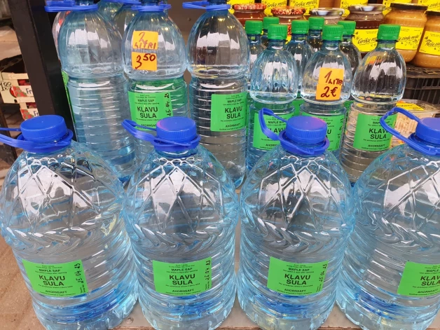 Rīgas Centrāltirgū parādījušās pirmās kļavu sulas. Cena - 6 eiro par pieclitreni