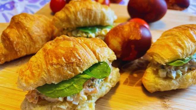 Šie sātīgie salāti paredzēti kruasānu un brokastmaižu pildīšanai, bet tos var pasniegt arī kā patstāvīgu ēdienu. Protams, kruasānu vietā var izmantot jebkuru maizi, kas vien pašiem garšo. Vēlams to pirms pārziešanas ar salātiem apgrauzdēt. Vajadzēs vārītas olas, mazsālītu vai kūpinātu lasi, baby spinātus, majonēzi, dilles, citrona solu un garšvielas.
