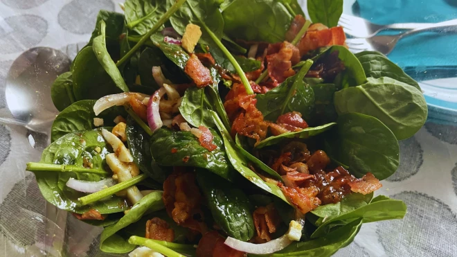 Ideja neikdienišķiem salātiem: divas veselīgas sastāvdaļas - spināti un olas - kuras papildina kraukšķīga bekona mērce. Vajadzēs auksti kūpinātu bekonu, sarkanvīna etiķi, ķiploku, brūno cukuru, sinepes, sarkano sīpolu, vārītas olas un garšvielas.