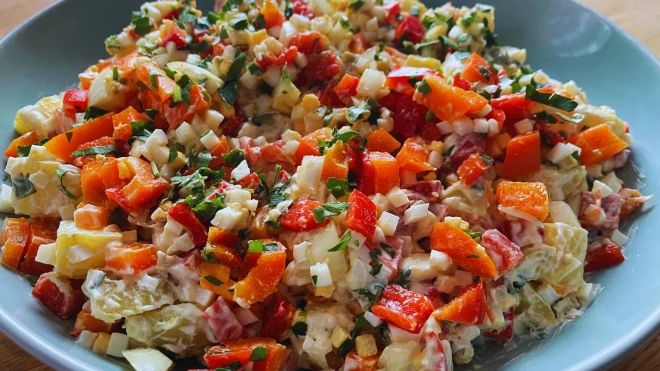 Šī ir vēl viena variācija par klasiskajiem kartupeļu salātiem. Tie lieliski sader ar marinēto cepto papriku. Vajadzēs vārītas olas, vārītus kartupeļus, saldo papriku, marinētu ceptu papriku, sīpolu, majonēzi un garšvielas.