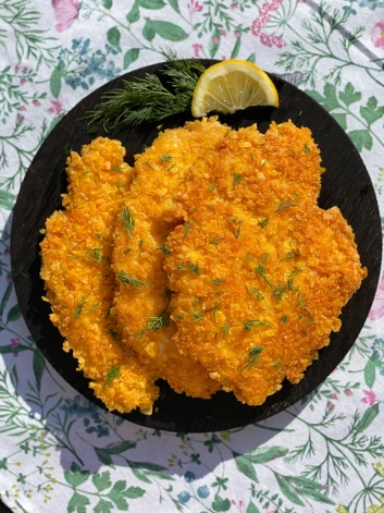 5. Vistas karbonādes apviļā miltos, tad olā, pēc tam kukurūzas pārslās pēc tam liek cepties pannā sakarsētā eļļā. Cep uz vidējas uguns no abām pusēm līdz zeltaini brūnas.