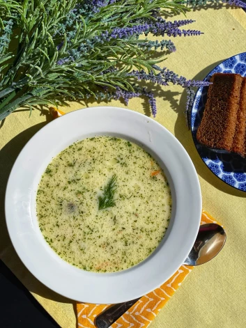 3. No vistas mugurkaula atkaulo visu gaļu un pievieno zupai. Kad zupa jau gandrīz gatava pievieno kausēto sieru, zaļos zirnīšus, zaļumus un pavāra vēl 2 minūtes, līdz siers pilnībā izkusis.