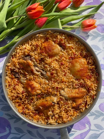 3. Rīsus noskalo un pievieno pannas saturam. Pacep 2 minūtes, tad pielej ūdeni un liek klāt vistas gabaliņus. Iemaisa buljona kubiņu, uzliek pannai vāku un uz mazas uguns lēnām vāra 17 minūtes. Pēc tam izslēdz uguni un ļauj ēdienam zem vāka vēl 5 minūtes gatavoties.