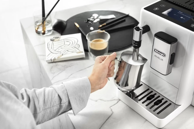 - LatteCrema Hot tehnoloģija: paaugstiniet savu kafijas baudīšanas līmeni ar vienu pogas pieskārienu. Rivelia LatteCrema Hot tehnoloģija perfekti saputo pienu, radot samtaini maigas struktūras, kas ir ideāli piemērotas late, kapučīno un citu specializēto dzērienu pagatavošanai. Iepazīstiet kafejnīcas kvalitātes dzērienus, nepametot savu māju ērtības.