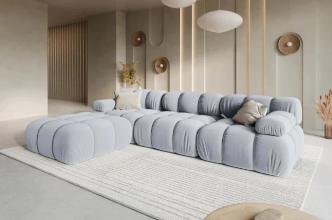 Visas mūsdienīgākās un aktuālākās mīksto mēbeļu tendences ir apvienotas šajā greznajā un modernajā moduļu dīvānā: noapaļotās dizaina līnijas, iespēja pielāgot dīvāna izkārtojumu savai gaumei un telpas interjeram, gaišais, pasteļa zilais tonis un velveta klusinātā elegance. Dīvāna rāmis izgatavots no koka, savukārt izcilu komfortu nodrošina sēdvietu pildījumam izmantotās atsperīgās poliuretāna putas. Piemērota izvēle arī lielākām ģimenēm, jo dīvāns nodrošina 4 ērtas sēdvietas.