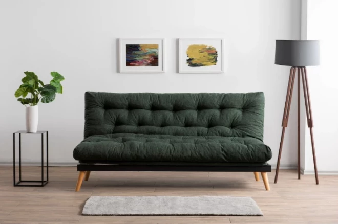 Ļoti gaumīgs un mūsdienīgs dīvāna modelis. Apdarē izmantots lins šobrīd tik aktuālajos tumšajos sūnu zaļajos toņos. Modernu akcentu piešķir 20 cm augstās dabīgā koka kājas, tumša metāla rāmis un spiedpogu veidotais raksts. Dīvāns, kas ir ne tikai gaumīgs, bet arī funkcionāls, jo nodrošina arī gulēšanas funkciju.