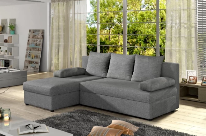 Klasiska dizaina un formas stūra dīvāns. Dīvāna apdare izgatavota no pelēka poliestera auduma, sēdvietu pildījumam izmantotas putas, savukārt rāmis izgatavots no izturīga priedes koka. Papildu ērtībai dīvāns aprīkots ar uzglabāšanas kasti, noņemamiem sānu roku balstiem un trīs ērtiem un gaumīgiem atzveltnes spilveniem. Kompakts un funkcionāls, būs ideāli piemērots arī nelielām dzīvojamām platībām, jo nodrošina arī gulēšanas funkciju.
