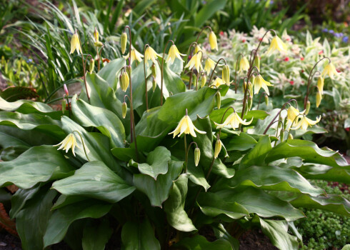 ‘Canary Brilliants’. Šīs šķirnes dūmakaini dzeltenie ziedi ar sārto tonējumu slejas uz metru gariem ziedkātiem. Zied vidēji vēlu. Krūms kompakts.