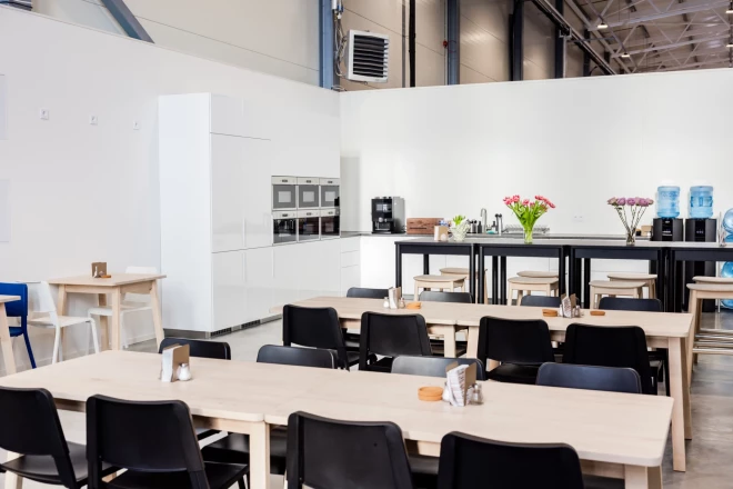 Tā kā ēdamtelpas zona pilda divus mērķus, tika izveidota plaša telpa, kura var uzņemt līdz pat 30 cilvēku. Bāra tipa galdi un krēsli tika stratēģiski novietoti netālu no telpas ieejas, ļaujot darbiniekiem ērti ieturēt maltītes vai paņemt pārtraukumus starp darbiem un pēcāk atsākt ikdienas rutīnu. Lai padarītu šo zonu estētiskāku, bāra krēsli un galdi no dabīgā bērza tika papildināti ar melnas krāsas mēbelēm un otrādi, radot vienotu gaisotni. Papildus tika izvēlēti vairāki krēsli zilos un baltos toņos, lai telpai piešķirtu košu un modernu izskatu. Galdi tika izvēlēti dažādos izmēros, nodrošinot darbiniekiem iespēju tos viegli pārkārtot un mainīt to izkārtojumu, neatkarīgi no tā, vai viņi pusdieno individuāli vai kopā ar visu komandu.