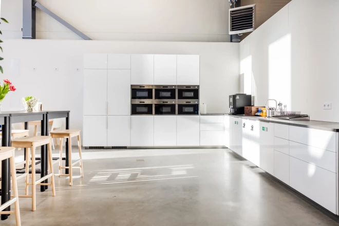 Papildus tam, ka atvērtā tipa biroja zona atrodas pilnībā funkcionējošās ražošanas telpās, sanāksmju telpa tika ierīkota konteinerā. Viena no konteinera sienām ir caurredzama un ļauj tajā ieplūst dabiskajai gaismai. Ņemot vērā sanāksmju telpas garo un šauro plānojumu, dizainere izvēlējās izvelkamu, spīdīgi baltu galdu, kuru var ērti pielāgot līdz pat 8 cilvēku vajadzībām. Galda virsma ir pārklāta ar īpašu apdari, lai padarītu to vēl gludāku un izturīgāku.