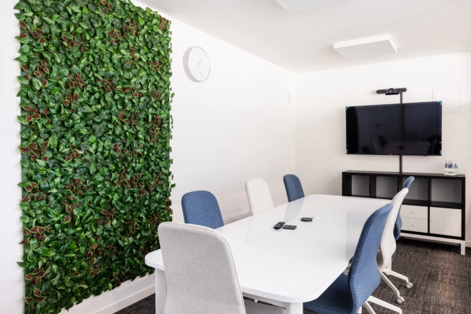 “Lai papildinātu galdu, tika izvēlēti moderni biroja krēsli bēšā un zilā krāsā. Šiem krēsliem ir regulējami slīpuma mehānismi, kas pielāgojas lietotāja svaram un kustībām, nodrošinot komfortu katram, kas izmanto krēslu. Ērtas sēdvietas sanāksmju telpās ir ļoti svarīgas, jo komforts veicina auglīgas diskusijas un ideju apmaiņu. Lai uzlabotu sanāksmju telpas gaisotni, viena no tās sienām tika dekorēta ar mākslīgiem augu paneļiem. Šie augi piešķir telpai dzīvīgumu, tekstūru un krāsu, atdarinot īstus augus, bet tiem nav vajadzīga papildus kopšana,” stāsta dizainere I. Puķīte.