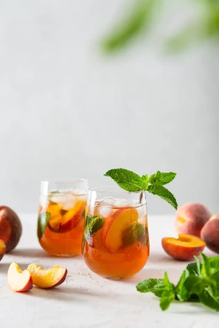 5. Liec glāzē ledu, pievieno 2–3 ēdk. persiku sīrupa ar augļu daiviņām un pārlej ar atdzesēto tēju.