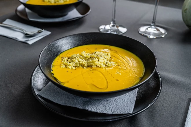 Pasniedz ķirbju krēmzupu ar bulguru kā garnējumu vai iemaisi to zupā.