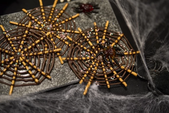 Bļodiņā izkausē šokolādi un lej to konditorejas maisiņā. Uz cepamā papīra pamīšus izkārto salmiņus. Konditorejas maisiņam nogriez galiņu un ar šokolādi pāri salmiņiem zīmē zirnekļtīklus. Paplāti ar cepamo papīru liec ledusskapī un ļauj sacietēt.