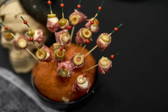 Mocarellas bumbiņas aptin ar salami, pa vidu piespraužot nelielu, apaļu olīvas gabaliņu, kas iezīmē acs zīlīti. Visu saspraud kopā ar irbulīti.