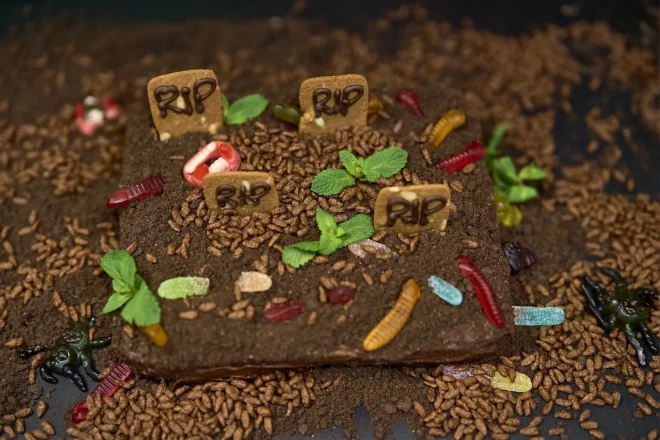 Uz gaišajiem cepumiem ar šokolādes vai cukura glazūru veido uzrakstus vai dekorus kā uz pieminekļiem un ieliec ledusskapī. Tumšos cepumus smalki sadrupini, samal vai izrullē ar mīklas rulli, lai iegūtu irdinātai zemei līdzīgu, tumšu masu. Ja kūka ir gaiša, tās virsu un sānus apsmērē ar šokolādes glazūru un uz tās ber tumšo cepumu “zemi”. Uzber arī šokolādes brokastu pārslas, kas izskatīsies pēc akmentiņiem. Tad saspraud kūkas virsū cepumu “pieminekļus” un izdekorē ar želejas tārpiņiem un citām konfektēm.