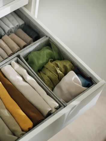Lai gan drēbju ar laiku mēdz kļūt vairāk, atbilstoši organizēšanas risinājumi var palīdzēt skapī uzturēt kārtību un ērtu izvietojumu. Atvilktnes skapī ir viens no labākajiem veidiem, kā uzturēt kārtību, nezaudējot stilu. Organizē apģērbus pa kategorijām – T-krekli vienā atvilktnē, bet džinsi citā, un tu vienmēr zināsi, kur viss atrodas. Ar SKUBB vai STUK (sākot no 2,49 eiro) kastēm, kas pieejamas IKEA veikalos, ir daudz vieglāk organizēt un uzglabāt tādus sīkumus kā šalles, jostas un apavus. Turklāt apģērbu izvietošana KOMPLEMENT kastēs (2 kastes par 12,99 eiro) vertikāli un kastu ar nodalījumiem izmantošana ļaus izņemt vienu apģērba gabalu, neizjaucot kārtību. Tādējādi skapja sakārtošana prasīs daudz mazāk pūļu un to veikt būs nepieciešams retāk.