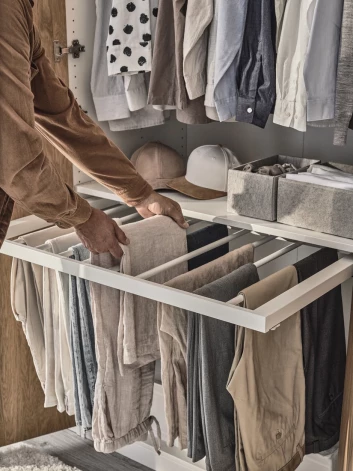 Ko darīt, ja tev ir vairāk drēbju un aksesuāru nekā vietas skapī? Lai arī jauna skapja iegāde var nebūt risinājums, garderobes piederumi gan var būt ļoti noderīgi. Tādi garderobes piederumi kā KOMPLEMENT plauktu sadalītājs un ieliktņi ļauj glīti organizēt itin visu, sākot ar salocītiem krekliem un beidzot ar aksesuāriem, lai viss būtu pa rokai. Šie nelielie pielāgojumi var radīt būtiskas izmaiņas tavā skapī. Arī KOMPLEMENT pakaramais par diviem eiro nodrošina ērtu vietu ārpus drēbju skapja, kur uzglabāt drēbes, kuras paredzēts gludināt, uzlaikot vai atsvaidzināt. Ērts risinājums, lai izžāvētu samirkušas drēbes, pirms likt tās atpakaļ skapī.