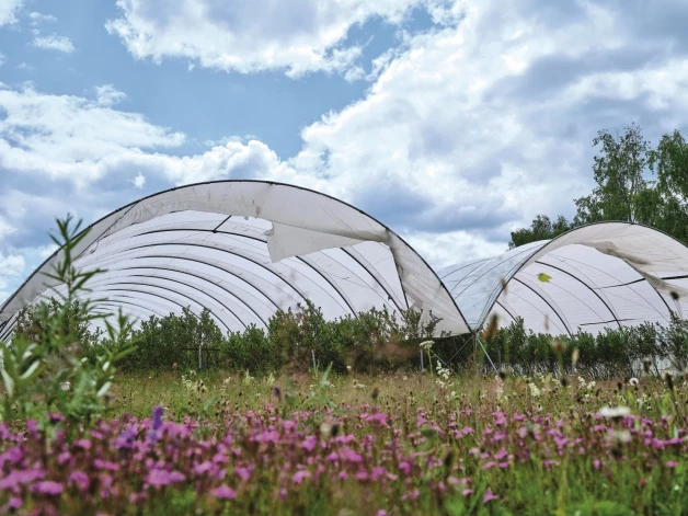 Siltumnīcās jeb augstajos tuneļos aug aptuveni 11 000 stādu, deviņas dažādas šķirnes. Tā ir vērienīga audzēšana, kas prasa daudz darba. Katru sezonu tuneļos no jauna uzvelk plēvi, ko rudeņos noritina. Plēvi var izmantot atkārtoti desmit gadus. Pilienlaistīšanai ūdens nāk no dīķa caur smilšu filtru, kas neļauj netīrumiem nonākt piliencaurulītēs. Ogas siltumnīcās lasa agri no rīta vai pēcpusdienā, tāpēc ka pusdienlaikā tur ir viskarstākais, un saimnieki var pievērsties kādiem citiem darbiem vai, kā paši smej, ir siesta! Katru gadu pavasarī paralēli plēvju uzvilkšanai notiek lielie darbi – krūmu izgriešana, kas ir ļoti svarīgi, lai krūms varētu atjaunoties un pilnvērtīgi ražot. Krūma mūžs ir aptuveni 25–30 gadi, bet ar labu kopšanu tas noteikti dzīvos ilgāk.