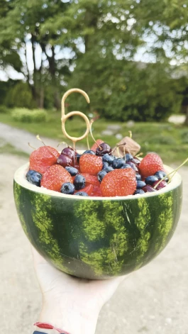 3. Veido kūku, arbūzā liekot 2/3 krēma, tad ogu/šokolādes kārtu un palikušo krēmu. Arbūzu liek ledusskapī.