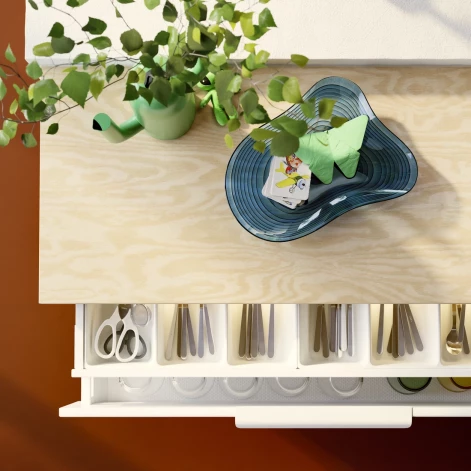 Ja arī pēc tam, kad ir pārskatītas lietas, kuras paturēt un no kurām atteikties, vietas trūkums telpā joprojām ir problēma, D. Rimkus iesaka izmantot aksesuārus par pieejamu cenu, piemēram, atvilktņu sadalītājus, kastes un kārbas, kas var daudz ko mainīt.