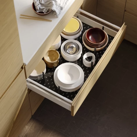 "Katliem un pannām ir vajadzīgs gudrs glabāšanas risinājums. Dziļas atvilktnes, pielāgojami atdalītāji vai pannu organizatori ļauj tās uzglabāt stāvus un izvairīties no smagnējas kaudzes efekta. Vākus var novietot statīvā vai piestiprināt skapīša durvju iekšpusē. Tā katram katlam un pannai ir sava vieta un to var ātri un vienkārši paņemt," iesaka Rimkus.