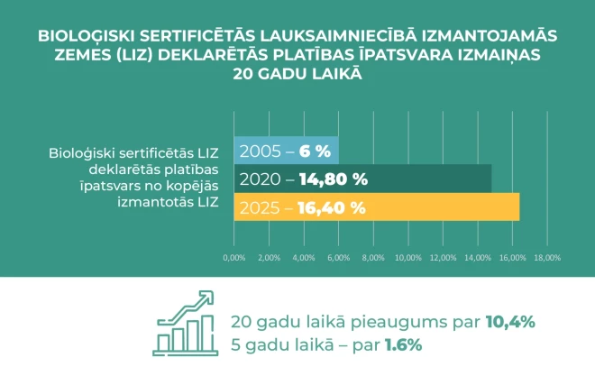Bioloģiskie zemnieki šogad apsaimnieko 324 tūkstošus hektāru, un tas ir par 18 tūkstošiem hektāru vairāk nekā gadu iepriekš. Arī šis gads parāda, ka jau 2024. gadā sāktais bioloģiskās lauksaimniecības platību ceļš augšup turpinās ar uzviju. Bioloģiskās lauksaimniecības zemes platība no kopējās lauksaimniecībā izmantojamās zemes platības sasniegusi vēsturiski augstāko punktu – vairāk nekā 16 procentu. Lai gan laikapstākļi bioloģiskos laukus un dārzus nav žēlojuši, platību pieaugums apliecina – bioloģiskajiem zemniekiem ir vēlme attīstīties.