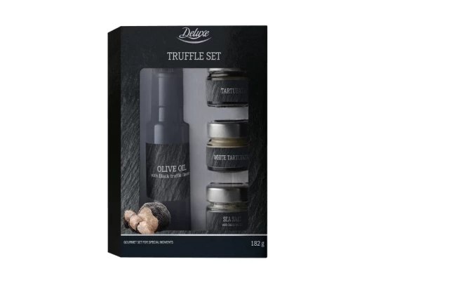 Ja nepieciešams iepriecināt kādu īpašu cilvēku, lieliski piemērots ir trifeļu dāvanu komplekts. Elegants iepakojums glabā vairākus rūpīgi atlasītus un izmantošanā daudzveidīgus “Deluxe” produktus, kas priecē gan ar garšu, gan ar vizuālo izskatu. Komplekts ļauj ienest trifeļu pasauli mājās, padarot maltītes īpašas un neaizmirstamas. Komplekta cena – 13,99 eiro.