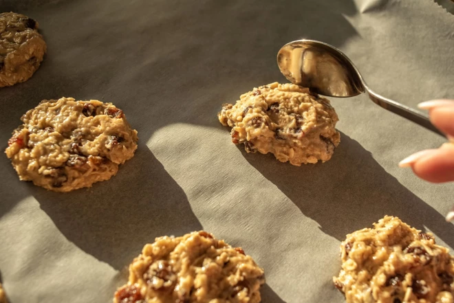 Uz katriem 2 banāniem ņem 50 g mīksta sviesta, 150 g smalku auzu pārslu, 100 g miltu un nedaudz ūdens. Banānu saspaidi un samaisi ar pārējiem produktiem. Izveido bumbiņas, liec uz plāts un pieplacini. Cep 15 minūtes 180 grādu karstā cepeškrāsnī. Vari pievienot arī rozīnes, riekstus, sēkliņas.