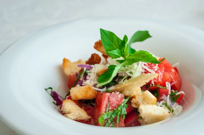 4.Salātu bļodā ber tomātiņus, sīpolus, ķiplokus, maizi un baziliku. Pielej mērci un izcilā. Ja vajag, pieber vēl sāli un piparus.