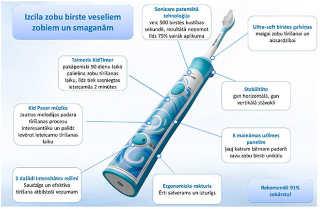 „Latvijā bērnu mutes dobuma stāvoklis kopumā nav labs, un galvenokārt tas ir saistīts ar zobu tīrīšanas ieradumiem. Kamēr bērns nav sasniedzis 10 gadu vecumu, vecākiem regulāri vajadzētu uzraudzīt bērna zobu tīrīšanu un, ja nepieciešams, tos pārtīrīt. Taču realitātē lielākā daļa vecāku ir pārāk aizņemti, lai to darītu, savukārt bērniem zobu tīrīšana saistās ar nepatīkamu, apnicīgu pienākumu, kuram ir daudz mazāka prioritāte nekā citām lietām. Sonicare For Kids apvieno gan izcilu 21.gadsimta tehnoloģiju, gan dažādas funkcijas, lai padarītu zobu tīrīšanas procesu bērnam saistošāku un interesantāku. Soniskās tehnoloģijas zobu birstes minūtes laikā veic tikpat birstes sariņu kustību, cik manuālās zobu birstes spēj veikt mēneša laikā, un šis fakts ļauj iztēloties iespaidīgo atšķirību zobu aplikuma noņemšanas efektivitātē. Sonicare For Kids ir labākais produkts, ko vecāki var iegādāties maksimāli efektīvām rūpēm par sava bērna mutes dobuma veselību.”