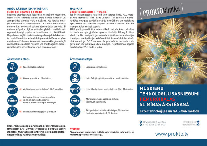 Hemoroidālo mezglu ārstēšana ar lāzertehnoloģiju, izmantojot LPS Dornier Medilas D Skinpuls lāzeri atbilstoši MCG Vācijas (Frankfurte pie Mainas) gastroenteroloģijas klīnikas tehnoloģijai.