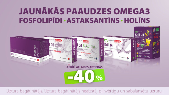 Lai vieglāk būtu pārvarēt pavasara nogurumu un rast spēku sagatavoties aktīvajai vasaras sezonai, vēlamies iepriecināt ikvienu - visu aprīļa mēnesi aptiekās LYL Krila eļļa līnijas produktus piedāvājot ar atlaidi līdz pat - 40%.