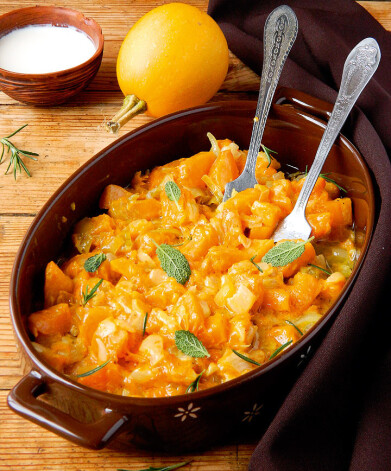 • Kad ķirbja sautējums gatavs (buljons būs izvārījies), piecas minūtes pirms pasniegšanas tajā iemaisa svaigus spinātus. Pasniedz kopā ar prosu, kuskusu, kvinoju vai savvaļas rīsiem, pārkaisot ar svaigi sakapātiem zaļumiem un grauzdētām mandelēm.