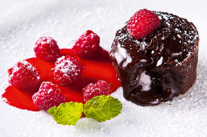 • Gatavo krēmu sadala 4–6 deserta trauciņos un liek ledusskapī vismaz uz 30 minūtēm. Kamēr deserts mazliet atdziest, pagatavo aveņu mērci. Avenes sablenderē, izkāš caur rupju sietu, lai atdalītu kauliņus, un pievieno agaves vai kļavu sīrupu pēc garšas. Gatavo desertu pasniedz rotātu ar svaigām ogām un pārlietu ar aveņu mērci.