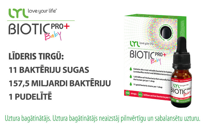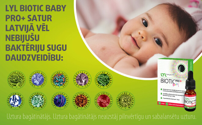 Labā ziņa ir tā, ka vietējais farmācijas zīmols LYL, sekojot jaunākajiem pētījumiem un to atklājumiem, radījis tieši tādu produktu, kas spēj palīdzēt mazulīšiem un tā satrauktajiem vecākiem. LYL BIOTIC Baby PRO+ satur ne tikai abas pētījumos apskatītās baktērijas, bet arī vēl citas augstas aktivitātes pienskābās jeb laktobaktērijas, bifidobaktērijas un Streptococcus. Tas ir labo baktēriju komplekss ar Latvijā lielāko baktēriju skaitu un plašāko sugu daudzveidību vienā pudelītē. Šīs suspensijas baktērijas apstrādātas īpašā tehnoloģijā, kas garantē to aktivizēšanos tikai zarnu vidē, tā padarot tās īpaši efektīvas. Kā arī, pateicoties šai tehnoloģijai, LYL BIOTIC Baby PRO+ pudelīte nav jāuzglabā ledusskapī – māmiņa to var ērti nēsāt līdzi, kā arī ņemt ceļojumos. Vienā pudelītē ietilpst 150 pilieni, kas pietiekami 30 dienām. LYLBIOTIC Baby PRO+ ir arī viens no retajiem probiotiķiem tirgū, kas ir brīvs no jebkādām palīgvielām, kā arī nesatur mākslīgās krāsvielas, lipekli, konservantus, sāli vai raugu, alergēnus, smagos metālus vai ĢMO.