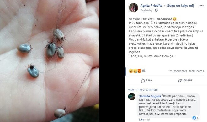 Kā novēroja portāls “Jauns.lv”, sociālajos tīklos cilvēki jau sākuši aktīvi brīdināt cits citu par ērču parādīšanos.