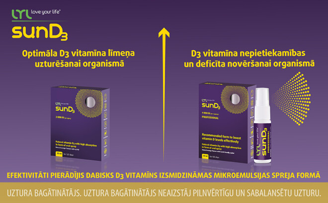 Īsumā atsauksim atmiņā manu D vitamīna epopeju. Pagājušā gada ziemā un pavasarī es uzcītīgi lietoju D vitamīnu. Vasarā, kā jau daudzi, biju pārliecināta, ka vajadzīgo daudzumu uzņemšu ar sauli. Septembrī veiktās analīzes uzrādīja, ka iepriekš sasniegtais D vitamīna līmenis pēc vasaras ir krities un aizsniedzās vien līdz 31 atzīmei, kas ir pietiekams, bet nebūt nav vēlamais rezultāts. Devos pie ārsta, lai kaldinātu plānu. Viņa ieteica man jau zināmo LYLsunD3 izsmidzināmo mikroemulsiju, bet šoreiz nevis ar 2000 SV, bet gan versiju, kas domāta D3 vitamīna deficīta novēršanai - LYLsunD3 PROFESSIONAL 4000 SV.