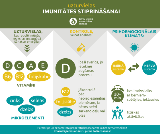 Visi minētie vitamīni un mikroelementi regulē imūnās reakcijas un apgādā šūnas ar enerģiju. Visi zina, ka ziemas laikā Latvijas iedzīvotājiem trūkst D vitamīna, tas ir saistīts ar saules gaismas trūkumu gada tumšākajā periodā. Tādēļ vērtīgi, veicot analīzes un konsultējoties ar ģimenes ārstu, parūpēties par to, lai D vitamīns būtu atbilstošā daudzumā. Tas ir jo īpaši svarīgi tieši bērniem, jo ietekmē augšanas procesu. Tāpat var pārbaudīt vitamīna B12, dzelzs, folijskābes līmeni asinīs, ja tas ir nepieciešams. Piemēram, ja jūsu bērns nepietiekoši ēd sarkanās gaļas produktus vai olas - varbūt tie viņam negaršo, vai jūsu ģimenes pieradumu dēļ (sarkanā gaļa tomēr nav tik populāra mūsdienās, piemēram, salīdzinot ar putnu gaļu, kurā nav pietiekoši daudz šo vitamīnu vai mikroelementu), kas nosaka ēdienkarti. Tam visam būtu jāliek aizdomāties par to, vai viss tas, kas nepieciešams jūsu bērna imunitātei, tiek pietiekami uzņemts dabīgā veidā. Omega-3 taukskābes (tās atrodamas zivīs) arī ir nepieciešamas ne tikai imunitātes, bet arī smadzeņu attīstībai un asinsvadiem, kaulu un nervu sistēmai.