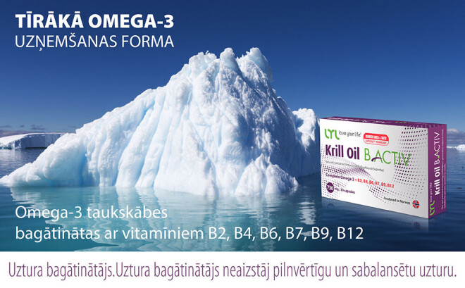 Esmu noskaidrojusi, kāpēc fiziski aktīviem cilvēkiem noteikti jāparūpējas par pietiekamu omega-3 un B grupas vitamīnu uzņemšanu. Nākamais jautājums – kā to visefektīvāk izdarīt? Visvairāk omega-3 ir treknajās jūras zivīs - siļķēs, skumbrijās, sardīnēs, lasī. Savukārt B grupas vitamīni – pupiņās, lēcās, zaļo lapu dārzeņos, pilngraudos. Lai arī kā censtos, vismaz man, ne vienmēr regulāri izdodas piepildīt pusdienu šķīvi ar šiem brīnumproduktiem, it īpaši tagad. Tāpēc liels bija mans prieks, interneta veikalā www.well24.eu atklājot šo, īpaši jaudīgo, kombināciju - LYL Krill Oil B ACTIV, kas nodrošina organismu gan ar omega-3 taukskābēm to pilnīgākajā formā, gan ar spēcīgāko no dabīgajiem antioksidantiem - astaksantīnu, gan ar sešiem nepieciešamākajiem B grupas vitamīniem – B2, B4, B6, B7, B9 un B12.